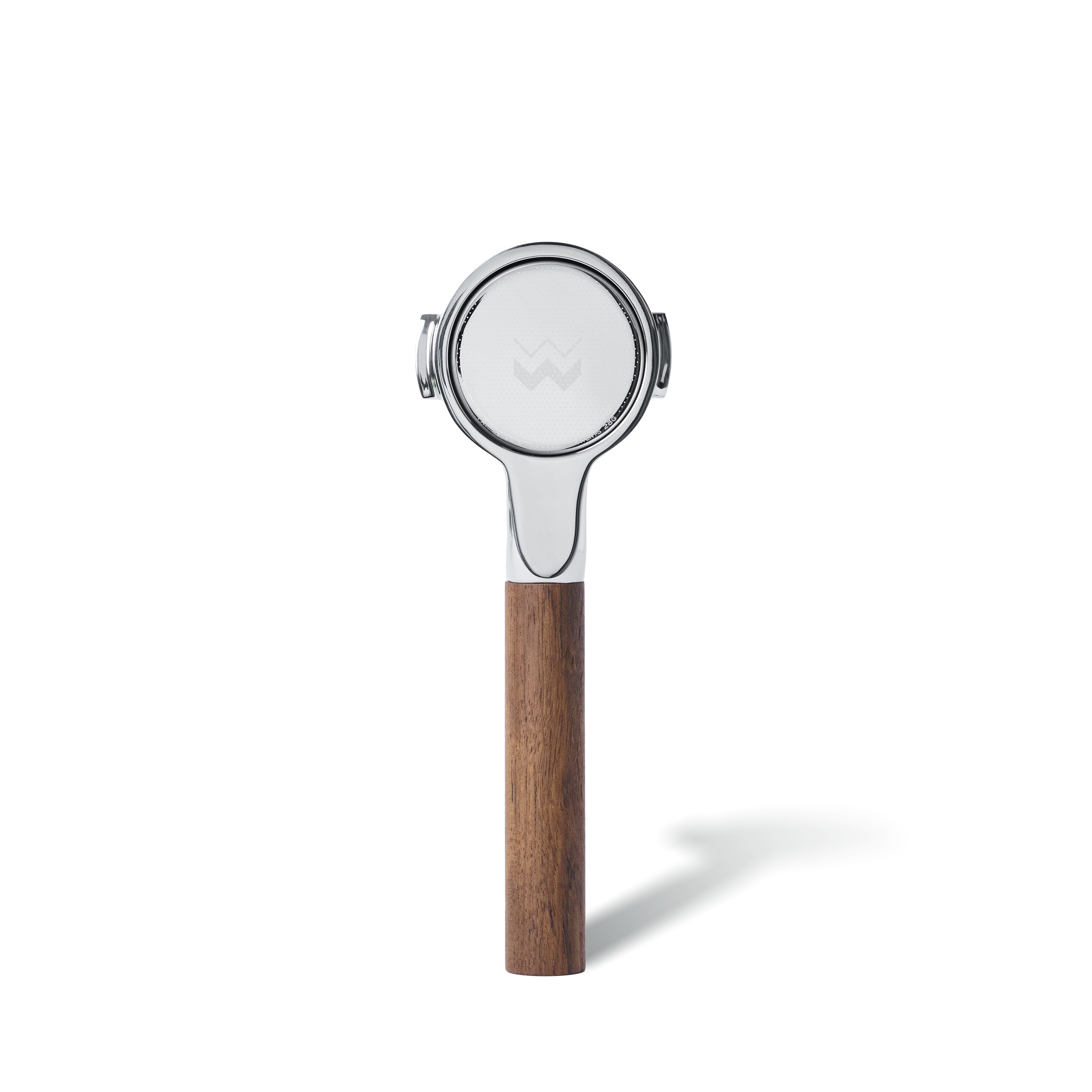 The Buck is a naked portafilter crafted from a block of forged, machined, and polished stainless steel. It is designed to sit flat on a countertop, eliminating the need for the awkward hanging-off-the-edge-while-tamping of standard portafilters. Both the FKM Rubber and Solid Teak handles have a solid stainless core which give the Buck the heft and strength to last a lifetime.